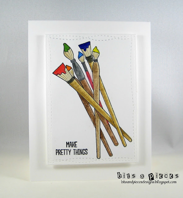 I finally got the Wonky Stitched Rectangles and used one to cut a panel to put my PTI paintbrushes on. They are colored with Inktense Pencils and I added a little Pico Embellisher to make the paint shine The sentiment is from WPlus9.