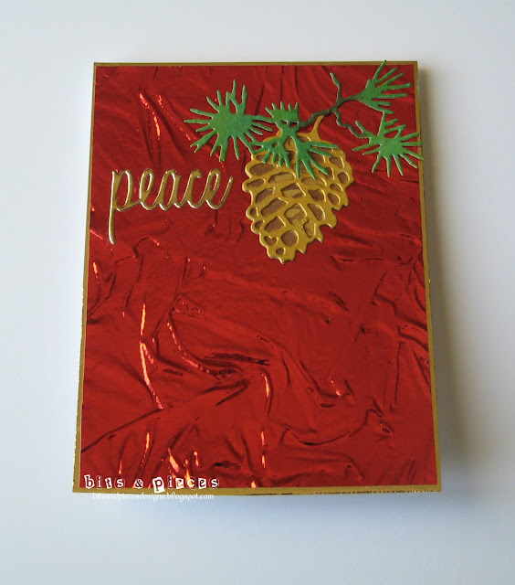 Can you believe I even got a decent picture of a shiny surface?  I laid it on my kitchen table with the sun shining in the window.  I may give up the light box if the sun continues to shine. ;)  Greens and word die by TH, pine cone by Gina Marie borrowed from Michele.