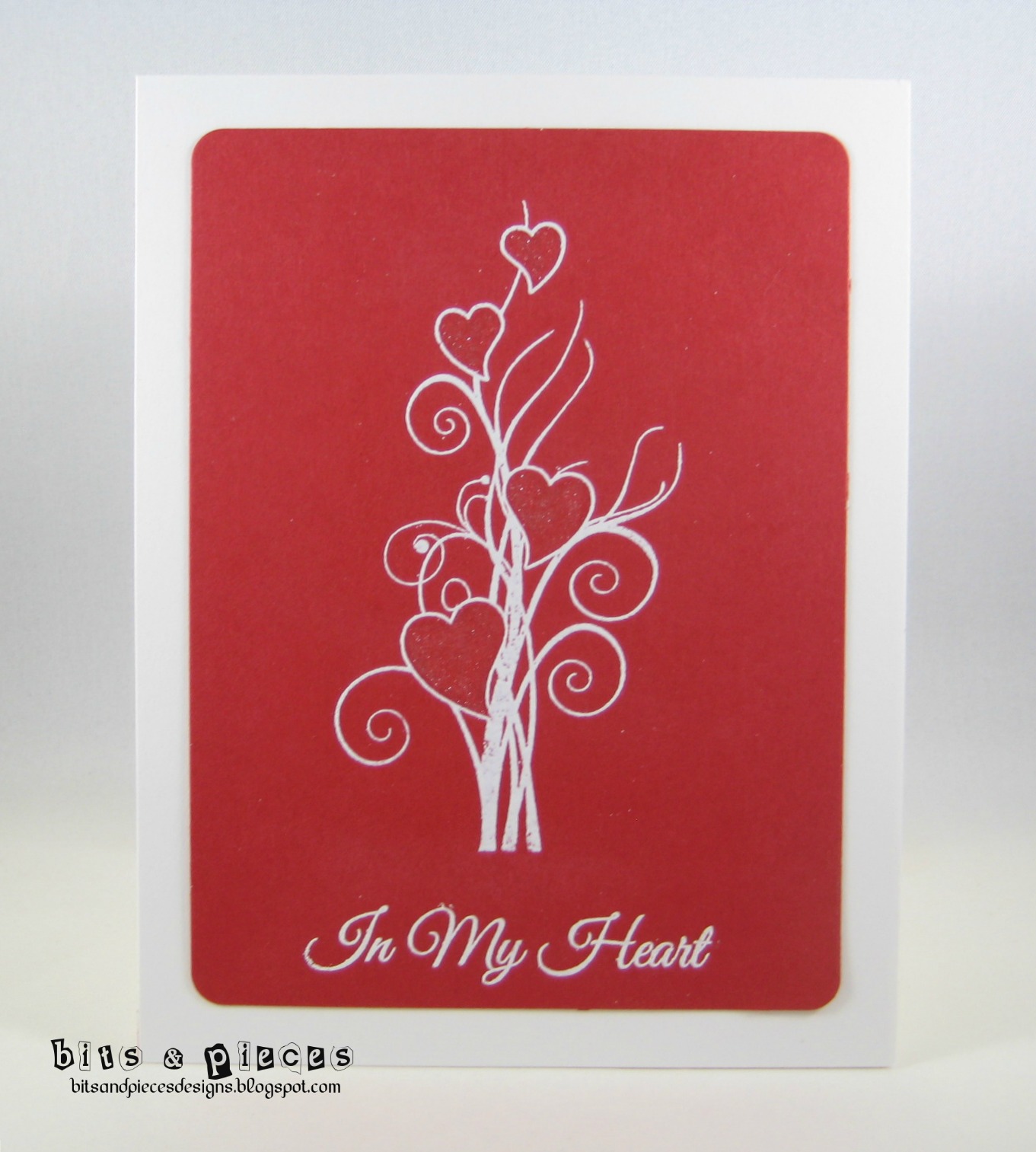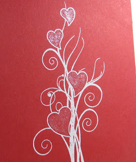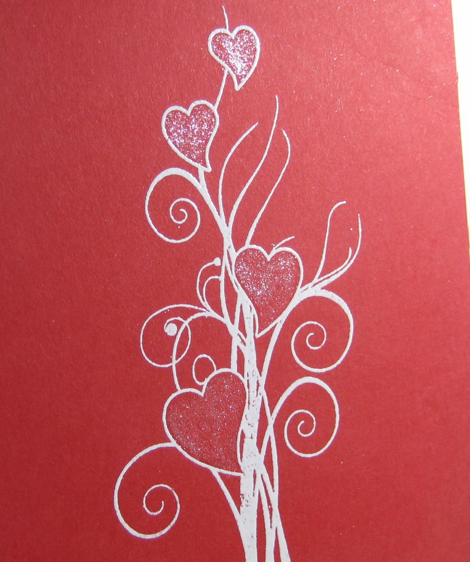 Doesn't that look just like love flowers growing? I used this stamp before in black with red Stickles. Here I white embossed the 'plant' and filled in the hearts with the SN Clear Sparkle pen. You can get a little glimpse of it in this close-up. It looks like red glitter IRL.
