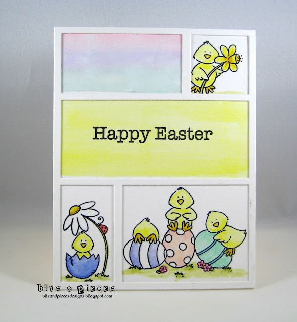 The card is watercolored with Distress Inks, including the two plain panels, with a sentiment from PTI. A little Spectrum Noir Glitter pen was added to the eggs.
