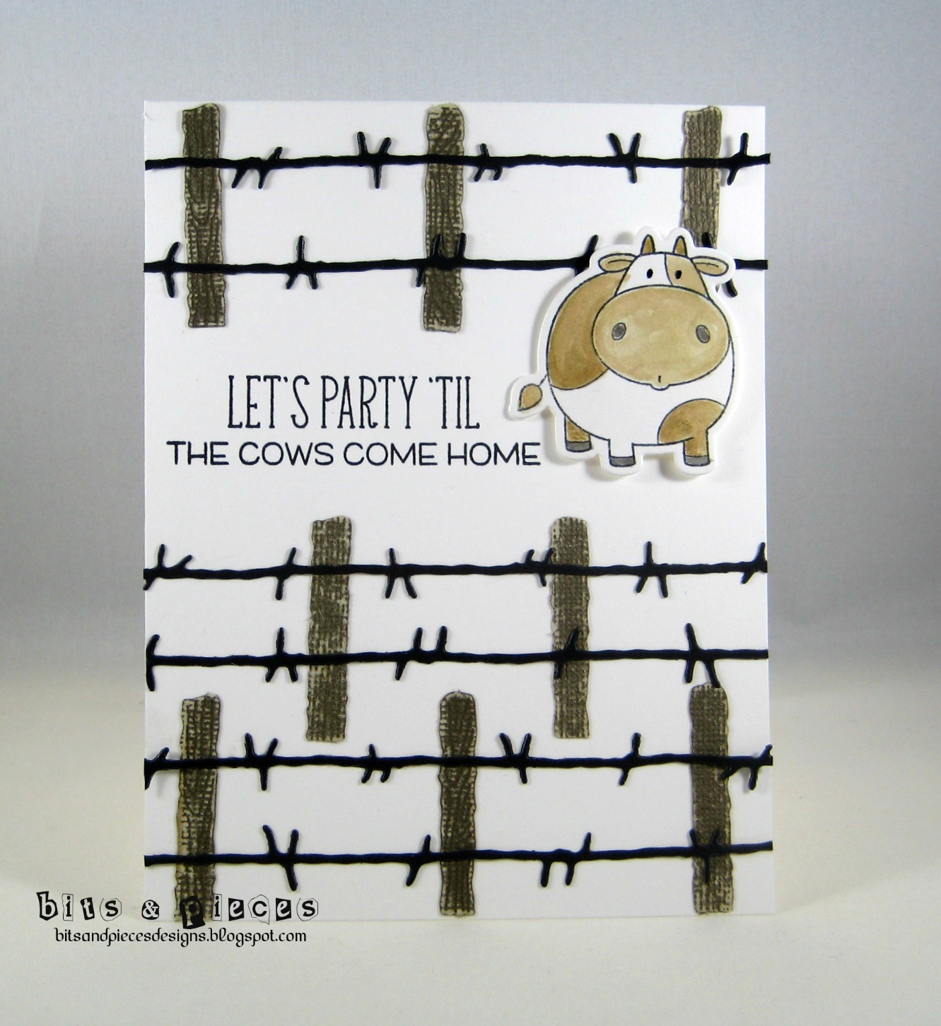 You probably recognize the cow from MFT. I colored him with Zigs and did a little Distress Ink grass. Different paper calls for different mediums. ;) The sentiment is computer generated and cut with a LF speech bubble.