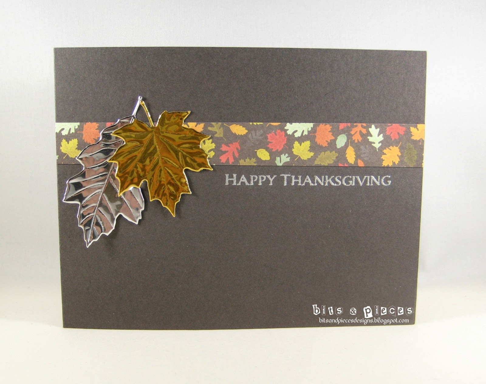I cut out that brassy looking leaf a while ago when I found some 'decorator foil' in my mother's stash and wondered how it would die cut.  As you can see it cut beautifully so I cut another one using the reverse side which was silver.  I just got a pack of fallish patterned papers and the strip goes perfectly with Smoky Shadow cs.  I need at least 15 Thanksgiving cards for my homebound people and this one brings it close to my goal.