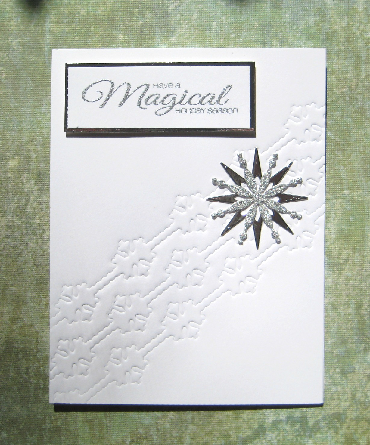 That garland die is from PTI. I cut one CF snowflake from silver mirror and one from glitter paper. I used the same silver paper to border the sentiment from CF that is embossed in Silver Glitter. It looks more like gold in this photo. Here's another one but it's not much better.