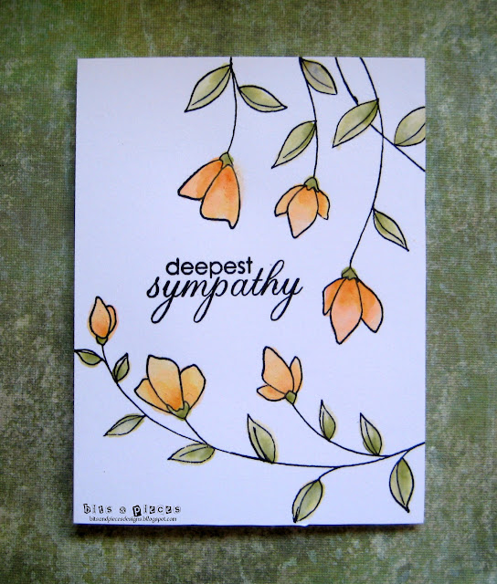 I'm getting low on sympathy cards so I used a stamp from PS along with flowers by PB that are colored with Distress Inks. Quick and easy and because it's one layer I can send it to Happy Little Stampers CAS challenge (one layer) and HLS Watercolor challenge (anything goes - without the twist of gold).