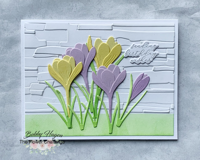 Looks like you, Nancy and I were all on the same wavelength using The Greetery's Crocuses die for our cards Bobby, and yours are absolutely BEAUTIFUL!! I love the brick wall yours are propped against...it really makes them POP!! And the colors are perfection in my humble opinion!! Lovely, lovely Spring card my friend!! Hugs. :0)